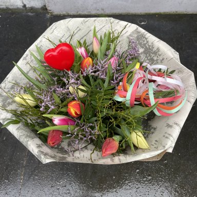 Vrolijk gekleurde tulpen gemengd met groen en bloemen, hartje en serpentine